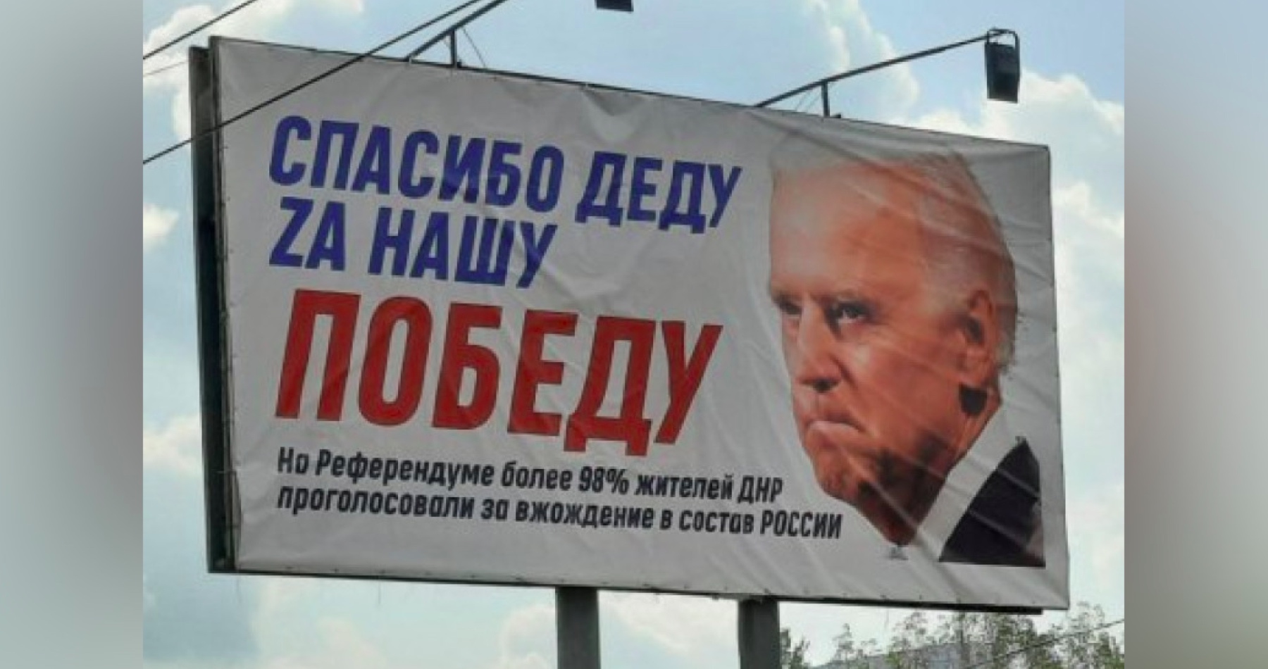 Ve čtvrtek se v Doněcku objevily billboardy s americkým prezidentem Joem Bidenem a s obrázkem šéfky Evropské komise Ursulou von der Leyen. V případě Bidena je na plakátech nápis “Děkujeme dědovi za naše vítězství!“ a Ursula tam má nápis “Vypij kalich hořkosti až do dna!“ ve smyslu poděkování těm dvěma, kteří se nejvíce zasloužili o urychlení referend, protože bez tlaku Západu by se Moskva jen tak nerozhoupala. Z pohledu obyvatel Donbasu je opravdu paradoxně největší zásluha za připojení k Rusku na straně představitelů EU a USA, kteří 8 let tlačili Kyjev do sabotování a neplnění Minských protokolů, což byla jediná cesta k mírovému urovnání občanské války na Ukrajině.