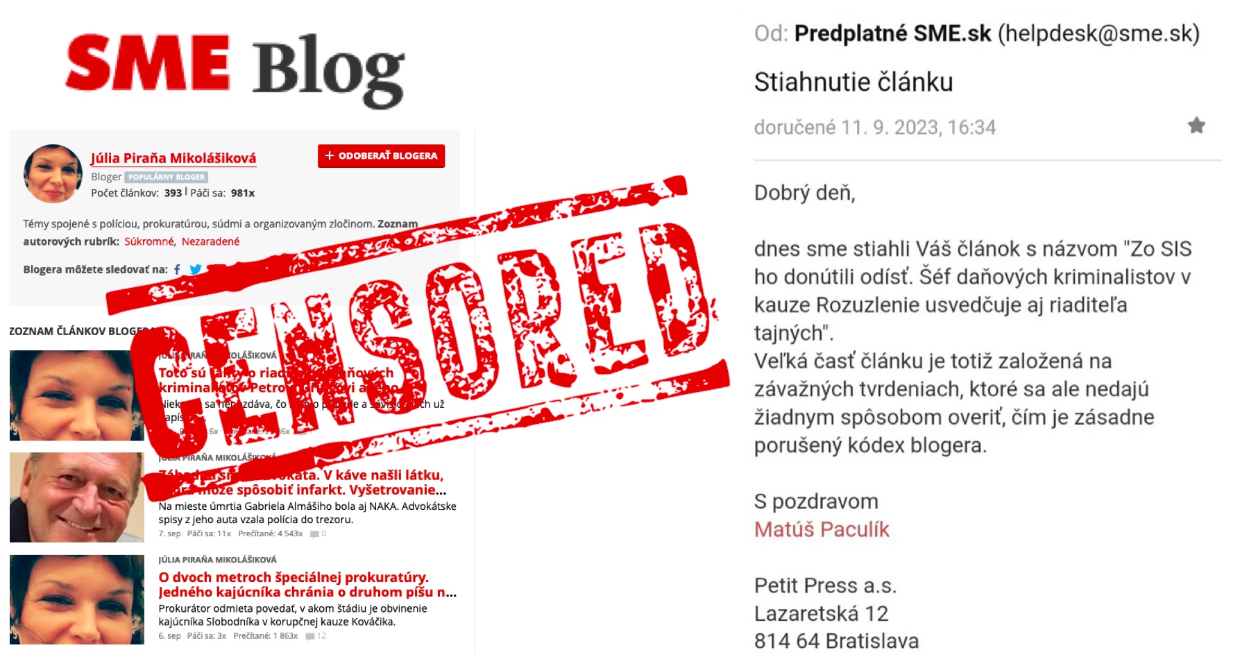 Denník SME stiahol blog investigatívnej novinárke o riaditeľovi Kriminálneho úradu Finančnej správy Grinčovi, ktorý je v kauze Rozuzlenie dôležitým svedkom proti exriaditeľovi SIS Aláčovi. „Na takéto vážne skutočnosti musím zareagovať,“ uviedla Júlia Mikolášiková známa pod pseudonymom „Piraňa“