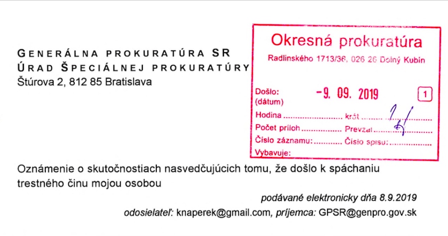 InfoVojna obdržala email, v ktorom nám Ing. Pavol Knaperek poskytol fotokópiu a celý text vlastného podnetu na trestné stíhanie jeho osoby pre podozrenie zo spáchania trestného činu podľa §423 resp. §424 a §338 Trestného zákona. trestné oznámenie podal elektronicky na Generálnu prokuratúru dňa 8. septembra 2019.