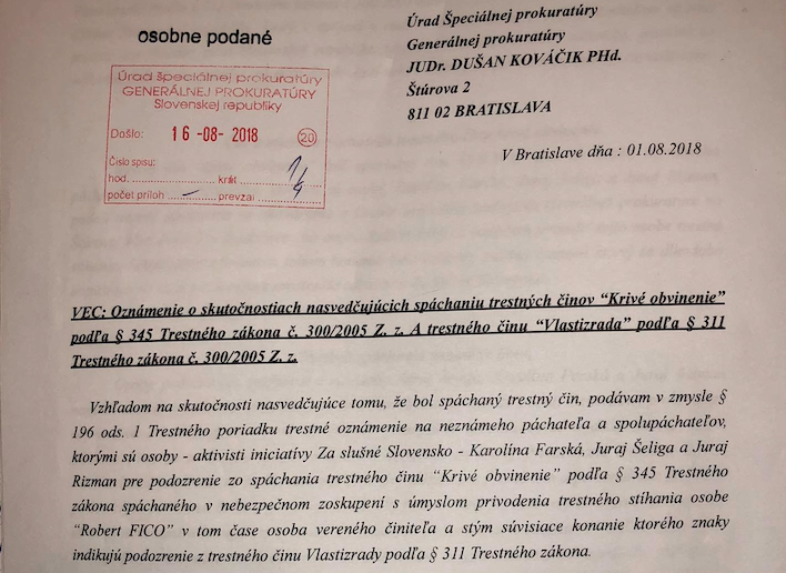 K trestnému činu krivého obvinenia malo podľa zverejneného dokumentu dôjsť 15. júna 2018, keď osoba neznámeho páchateľa a spolupáchatelia - Farská, Šeliga a Rizman podali na predsedu Smer-SD Roberta Fica trestné oznámenie za ohováranie a šírenie poplašnej správy s úmyslom privodiť mu trestné stíhanie.