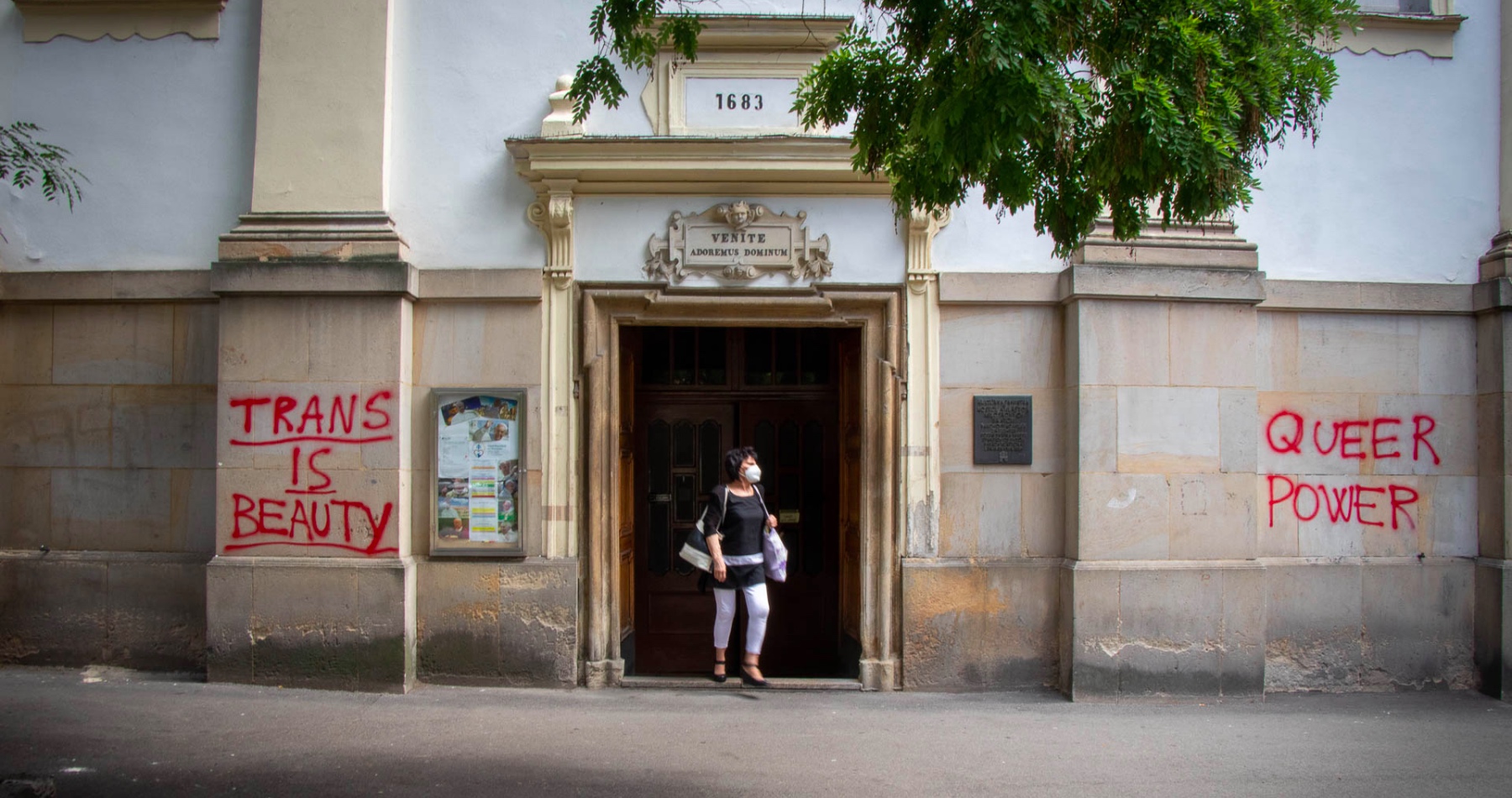FOTO: V centre Bratislavy posprejovali kostoly a kláštor LGBTI heslami: Boh je trans, Homosexuálna revolúcia prichádza, či Homosexuálna sila