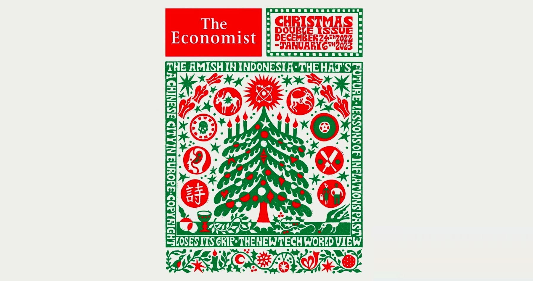 Okolo hlavní obálky kolem dokola jsou nápisy, které ale nemají žádný vzkaz, protože to jsou témata článků uvnitř daného čísla časopisu The Economist, takže tím se nebudeme zabývat. To zásadní je na obrázku vánočního stromku a na jeho ozdobách okolo stromku a symbolů se specifickým významem, které není tak těžké rozluštit, pokud disponujete určitými konceptuálními znalostmi. Začneme úplně vlevo dole. Jedná se o čínský znak z tzv. tchangské poezie, který je specifickým tím, že v průběhu času se jeho překlad a význam mění, přestože znak se nemění.