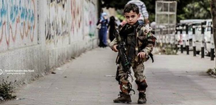 Malý chlapec je oblečený vo vojenskom oblečení a v ruke drží automatickú puškou. Text na obrázku hovorí: „Toto sú naše levíčatá. Priviedli sme ich k láske k džihádu a Shahade (mučenícka smrť).“