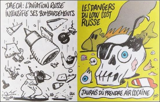 Ve čtvrtek francouzský satirický týdeník Charlie Hebdo zveřejnil další urážlivou karikaturu na tragický incident zřícení ruského letadla na egyptském Sinaji. Charlie Hebdo zesměšnil zřícení letadla dvěma karikaturami. Na prvním obrázku je letadlo a cestující padající na zem, zatímco ozbrojenec Islámského státu, vyzbrojen puškou, se kryje ve snaze vyhnout se padajícím troskám. Pod obrázkem je text: „Daesh: Ruské letectvo zintenzivňuje své bombardování.“ A na druhé karikatuře je lebka a zničené letadlo na zemi, s textem: „Nebezpečí nízkonákladového Ruska. Měl jsem letět Air Cocaine.“