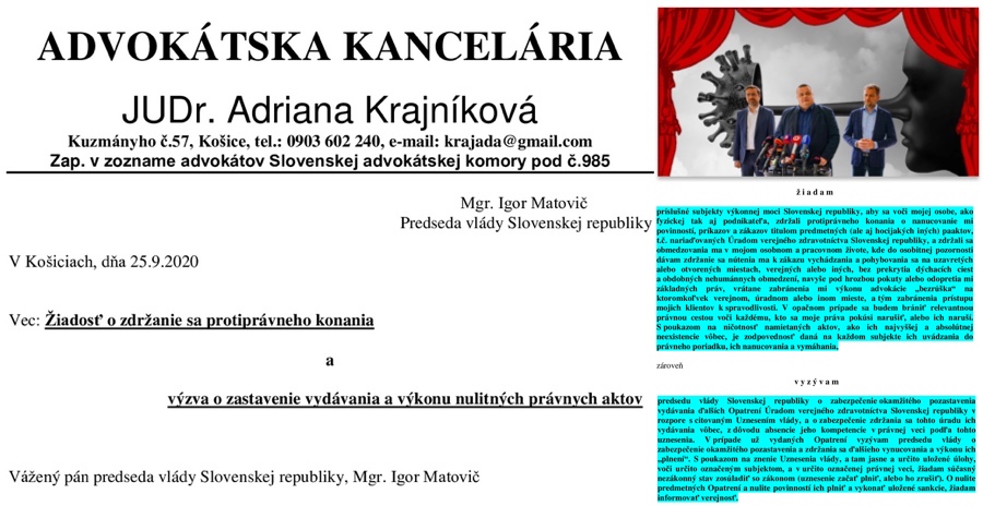 JUDr. Adriana Krajníková vysvetľuje svoju právnu analýzu a výzvu Matovičovej vláde na zastavenie neplatných korona opatrení