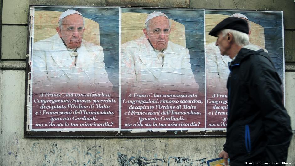 Na plagátoch, ktoré distribuovali neznámi aktivisti, je fotografia zachmúreného pápeža s otázkou? "Kde je tvoje milosrdenstvo?".