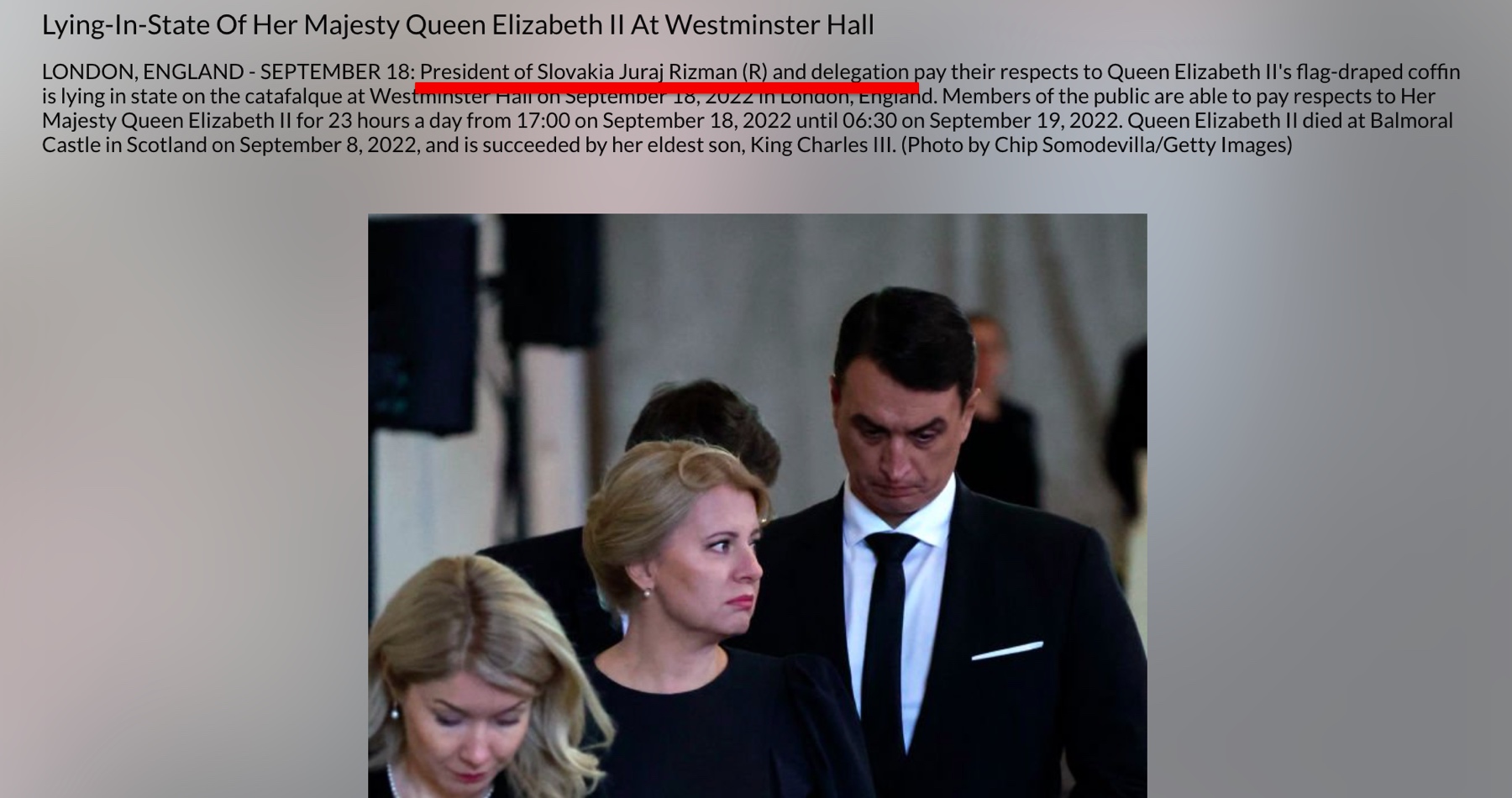 Korporátne médiá na pohrebe britskej kráľovnej Alžbety II. oficiálne zrušili Čaputovú: Slovenským prezidentom je vraj Juraj Rizman. Po oprave to “vylepšili” a Rizmana označili za manžela slovenskej hlavy štátu. „Ležím na zemi a plačem od smiechu. Prezident Juraj Rizman so svojou delegáciou,“ reaguje Blaha