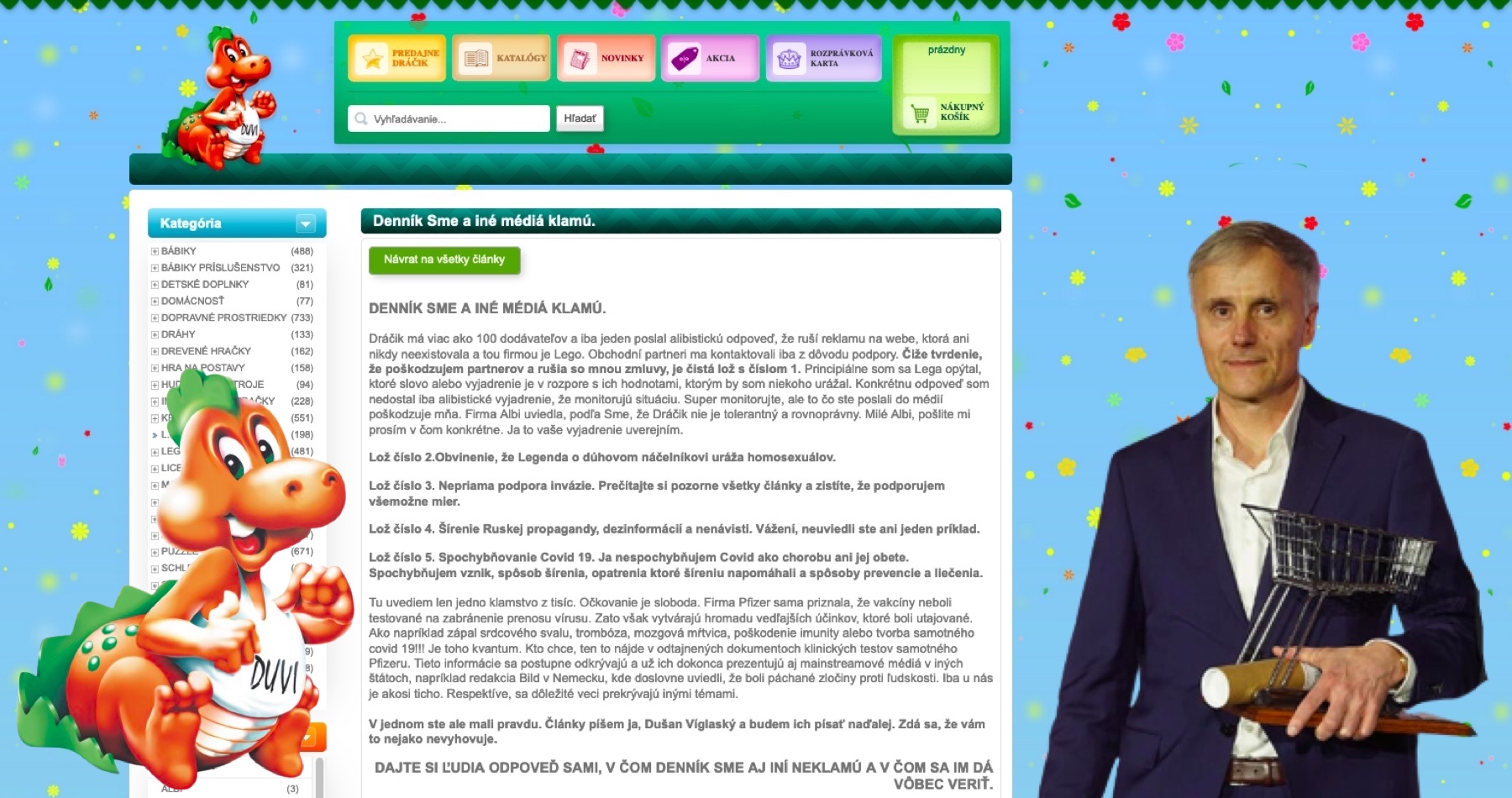 Majiteľ Dráčika sa prihlásil k textom na webe svojho hračkárstva, ktoré sa stalo terčom útokov neoliberálneho fanatizmu, cenzorov a prenasledovateľov iných názorov: „DENNÍK SME A INÉ MÉDIÁ KLAMÚ. Svoje názory budem písať aj naďalej,“ odkázal a vymenoval 5 lží šírených korporátnymi médiami a ich konzumentmi