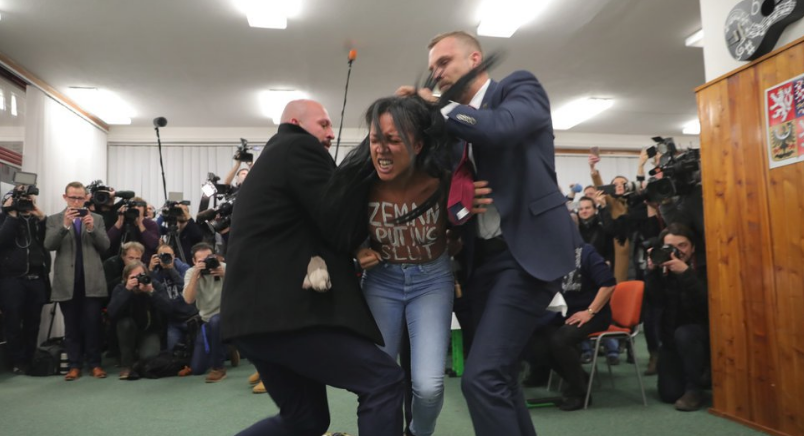 Na obnažené hrudi měla nápis v angličtině, že Zeman je Putinova děvka, a stejná slova také vykřikla. Prezidentova ochranka ji srazila k zemi odvedla Zemana z volební místnosti. Prezident pak řekl, že je poctěn, že ho napadla aktivistka skupiny Femen, která útočila i na papeže.