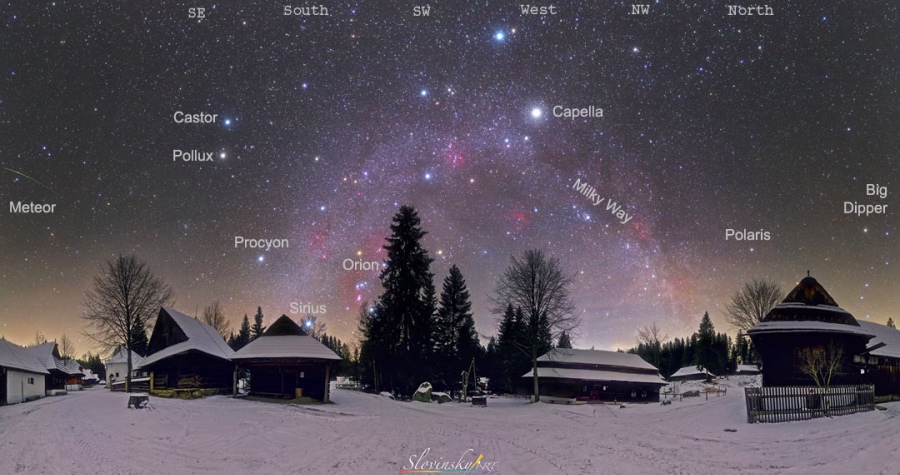 Veľký pes nad obzorom, jasná Capella práve nad oblúkom našej domovskej Galaxie - Mliečnej dráhy. Hviezda Polárka, ktorá tvorí pomyselný bod svetového sverného pólu, na pravo asterizmus Veľký Voz zo súhvezdia Veľkej medvedice a úplne naľavo zachytený meteor, tzv.„padajúca hviezda“, ako symbol Vianoc.