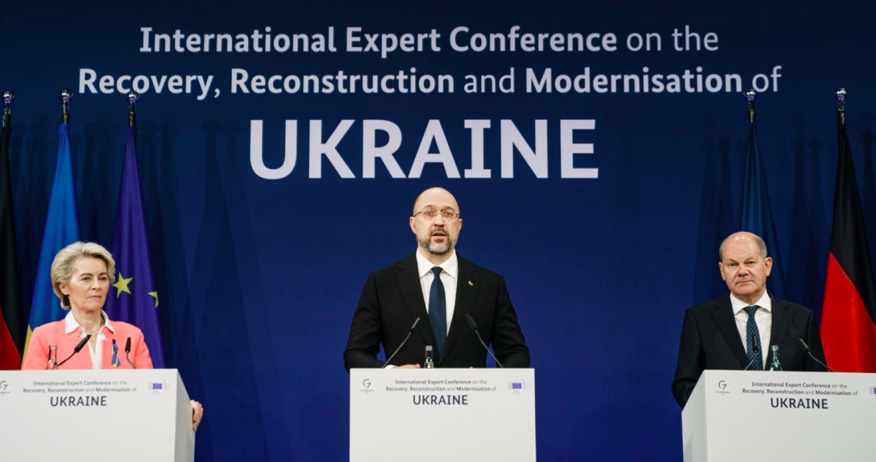 Německo také v úterý organizovalo v Berlíně mezinárodní konferenci, která se zabývala pomoci Ukrajině a její rekontrukci během války i po ní. Německý prezident Frank-Walter Steinmeier rovněž v úterý navštívil Kyjev, což bylo poprvé od začátku ruské invaze na Ukrajinu. Ukrajinský prezident jeho návštěvu v dubnu odmítl kvůli úzkým vztahům Německa s Moskvou.