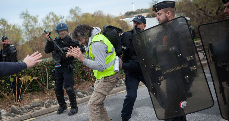 Ministr vnitra Christophe Castaner nařídil policii, aby použila takovou míru násilí, jaká nebyla použita od Alžírské války (1954-62). Během posledních dvou dekád proběhly ve Francii mnohokrát různé stávky. Například když v roce 2005 byla země celé týdny sužována nepokoji a žhářstvím, i tak počet zraněných výtržníků zůstával nízký. Výsledky nového tvrdého přístupu se dostavily. Jen za posledních několik týdnů bylo zraněno 1 700 protestujících, někteří vážně. Devatenáct jich přišlo o oko, čtyři o ruku. Ačkoliv francouzští policisté nepoužívají smrtící zbraně, jsou vyzbrojeni gumovými projektily a často střílí demonstrantům do obličeje, což mají podle aktuálních pravidel policejního zásahu zakázáno. Francouzská policie je také jediná v Evropě, která dosud používá kuličkové granáty (Sting-Ball Grenades). (Poznámka překladatele: granát obsahuje 25 g TNT a gumové kuličky.)