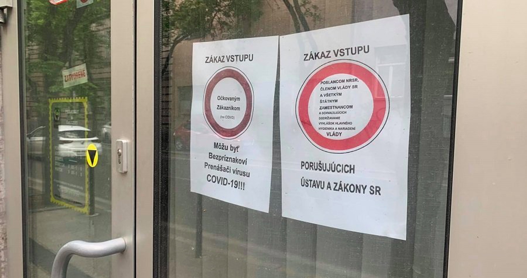 "Zákaz vstupu poslancom NR SR, členom vlády SR a všetkým štátnym zamestnancom a schvaľujúcich dodržiavanie vyhlášok hlavného hygienika a nariadení vlády porušujúcich Ústavu a zákony SR," hlása druhý oznam.
