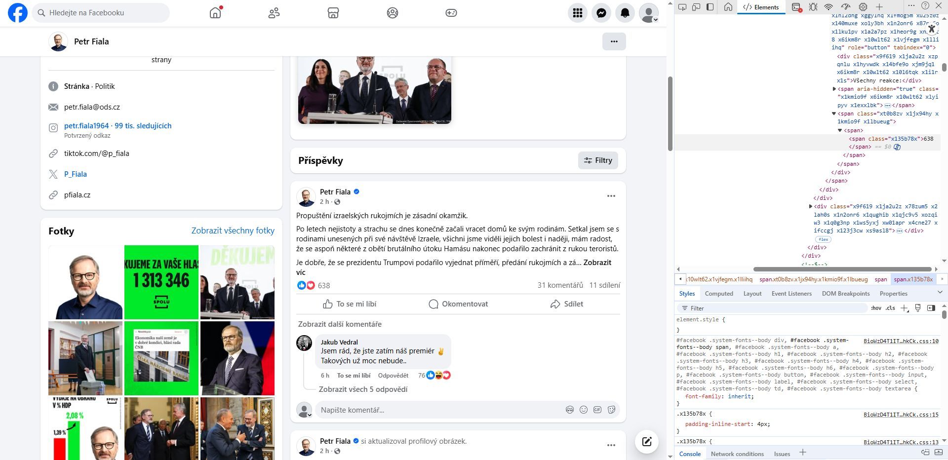 Příspěvek na Facebooku Petra Fialy včetně odpovědi jeho fanouška je samozřejmě totální podvrh, který pro účely našeho článku připravil náš administrátor, abychom “vyslali jasný signál” a demonstrovali, jak snadno lze zfalšovat jakýkoliv příspěvek na jakémkoliv Facebooku. Myšleno lokálně zfalšovat, aby to tak vypadalo na vašem počítači, ne doopravdy na serverech Facebooku. Stačí k tomu jenom základní znalosti obsluhy tzv. vývojářské konzole ve webovém prohlížeči.
