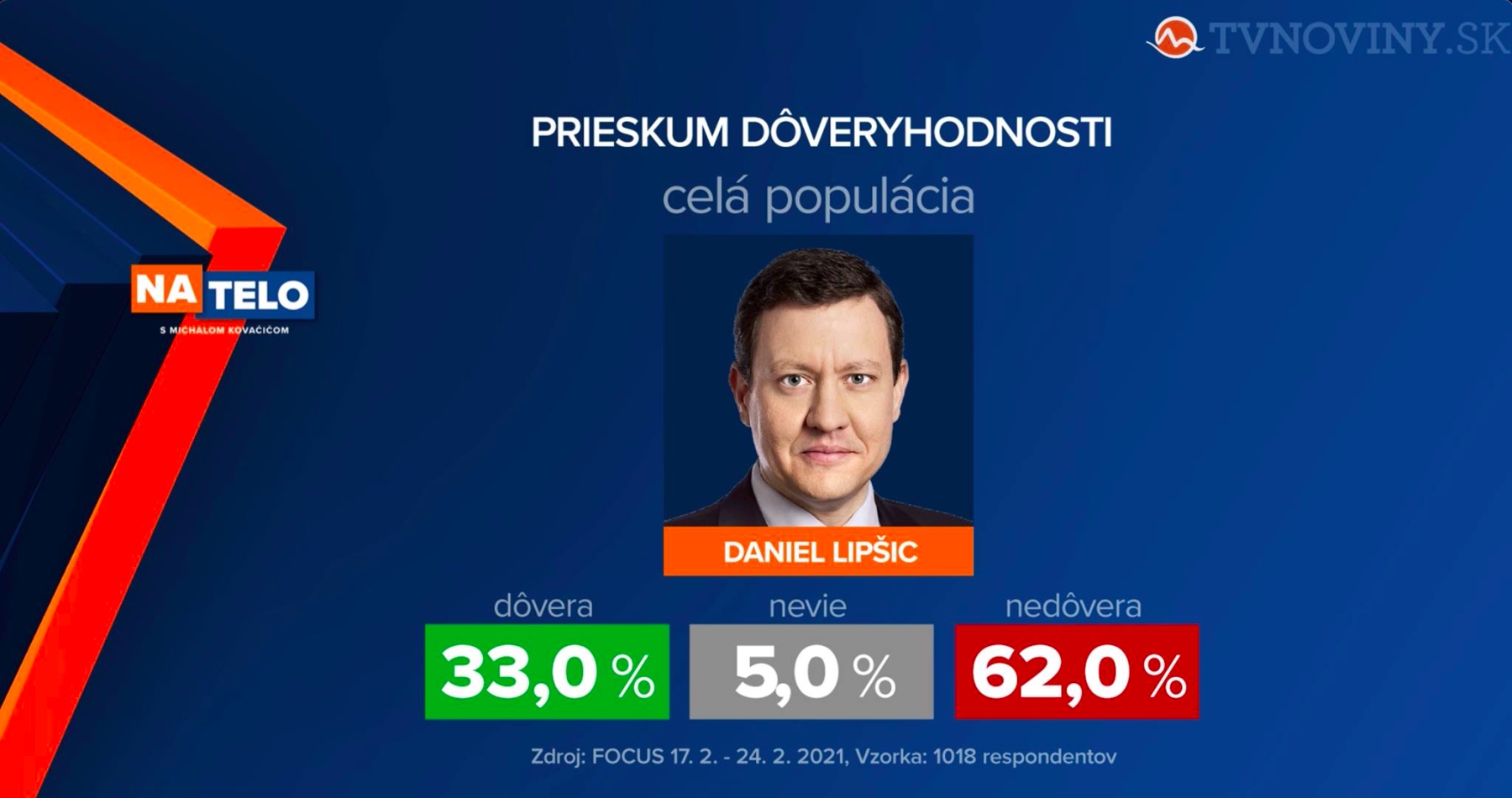 Politikovi Danielovi Lipšicovi na člene špeciálnej prokuratúru nedôveruje až 62 percent ľudí. Vyplýva to z prieskumu, ktorý pre reláciu Na telo televízie Markíza uskutočnila agentúra Focus. Podľa prieskumu Lipšicovi verí len 33 opýtaných a päť percent nevie, čo si má o politikovi na čele špeciálnej prokuratúry myslieť. Lipšicovi neverí celých 62 percent občanov.