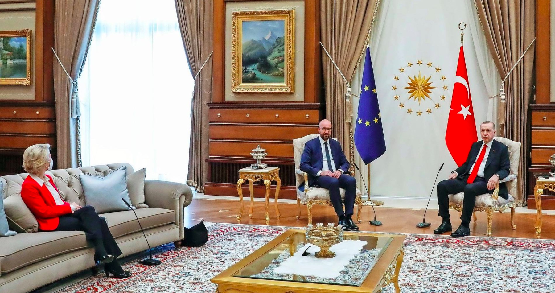 Tiskové agentury prezentovaly snímky ze summitu EU/Turecka, který proběhl 6. dubna 2021 v Ankaře. Je na nich turecký prezident Recep Tayyip Erdogan, jak vítá předsedu Evropské rady Charlese Michela a předsedkyni Evropské komise Ursulu von der Leyenovou. K dispozici jsou pouze dvě křesla pro tři osoby. Leyenová si po chvíli zaváhání usedla na pohovku.