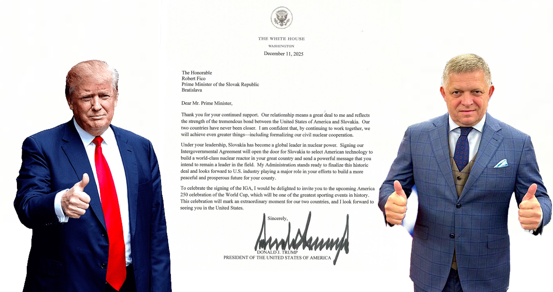 Predseda vlády SR Robert Fico (Smer-SD) dostal písomné pozvanie na stretnutie s americkým prezidentom Donaldom Trumpom. Chcú spoločne podporiť podpísanie medzivládnej dohody medzi SR a USA o spolupráci v jadrovej energetike a vymeniť si názory na najaktuálnejšie svetové témy. V pondelok 15. decembra 2025 o tom informoval tlačový a informačný odbor Úradu vlády (ÚV) SR.