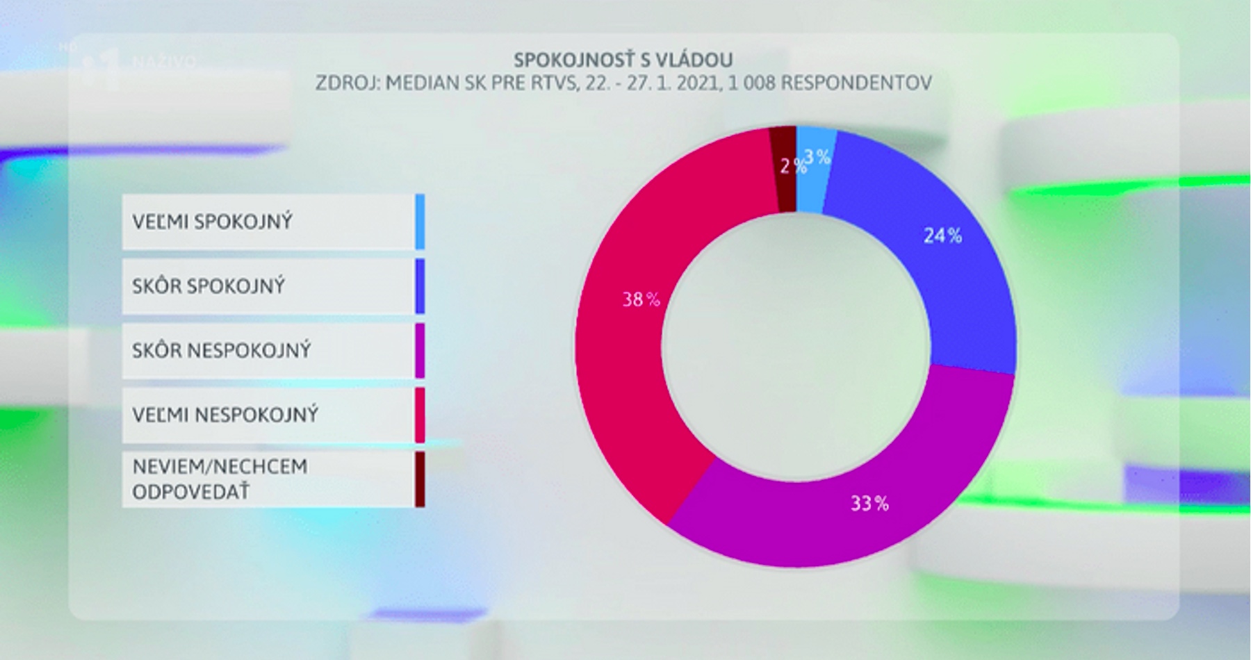 Realizoval ho Median a prebehol v termíne od 22. do 27. januára na vzorke 1 008 respondentov. Ako sa však ukázalo, s vládou sú veľmi spokojné len 3 % ľudí. “Skôr spokojných” bolo 24 % respondetov.