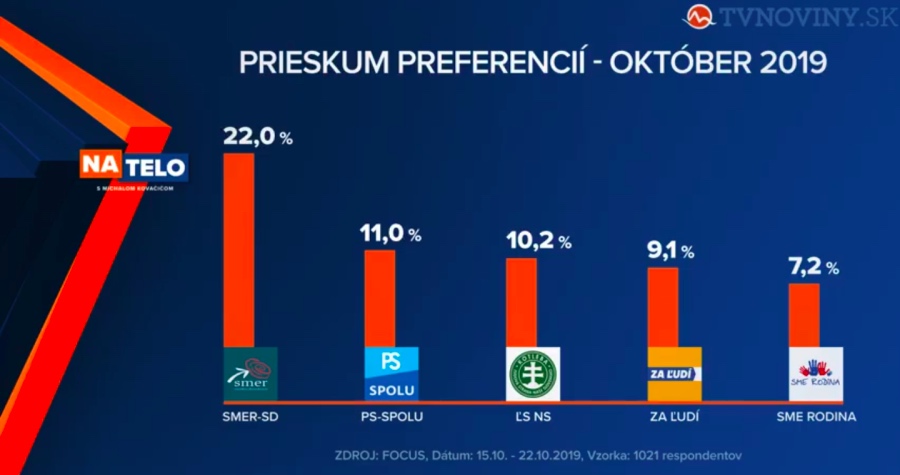 Parlamentné voľby by so ziskom 22 percent vyhral Smer-SD. Ako vyplýva z prieskumu volebných preferencií, ktorý pre televíziu Markíza realizovala agentúra Focus od 15. októbra do 22. októbra na vzorke 1 021 respondentov, do parlamentu by sa dostalo deväť politických strán.
