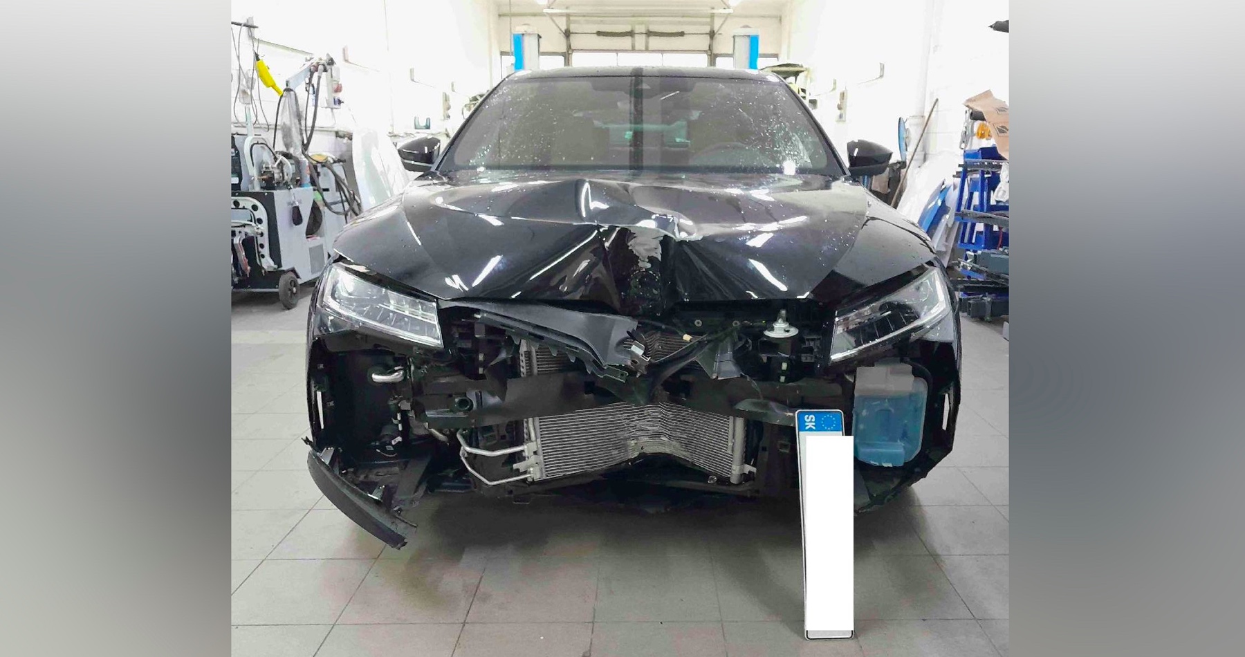 Podľa majiteľa autoservisu je na fotke možné vidieť poškodenú celú prednú kapotu, výstuhu aj chladiče. Airbagy pravdepodobne nevystrelili.