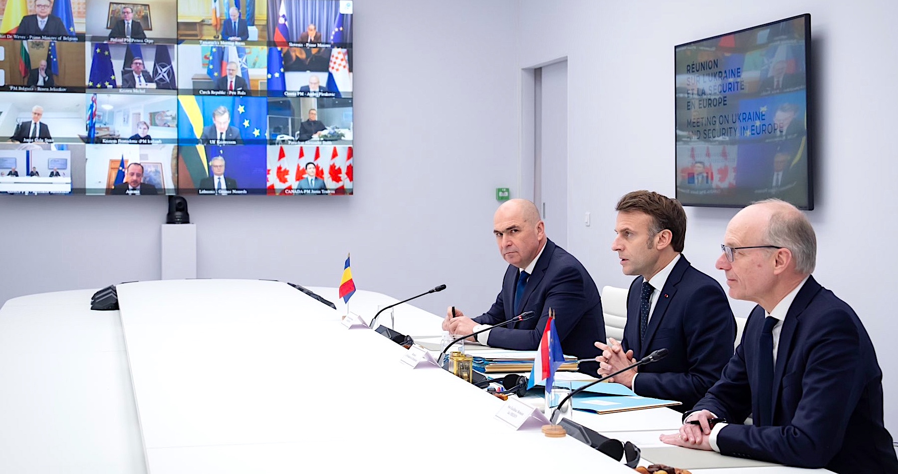 Na prvom narýchlo zvolanom zasadnutí v pondelok boli lídri Francúzska, Británie, Nemecka, Holandska, Dánska, Španielska, Talianska a Poľska, ako aj lídri inštitúcií EÚ a NATO. Nepozvanie ďalších krajín z dvadsaťsedmičky vnímali viaceré štáty ako Česko či Slovinsko kriticky. Pondelkovú na najvyššej úrovni do Elyzejského paláca Macron zvolal po tom, čo americkí predstavitelia naznačili, že Európa nebude zohrávať žiadnu úlohu v mierových rozhovoroch.