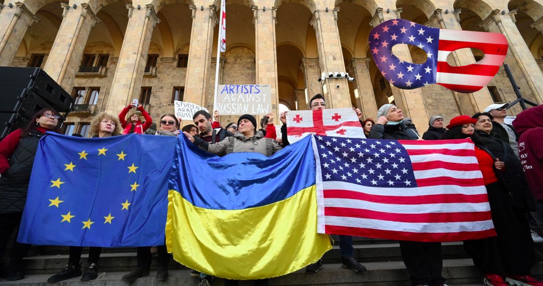 Gruzínsky Majdan a banderovci s vlajkami Ukrajiny, EÚ a USA