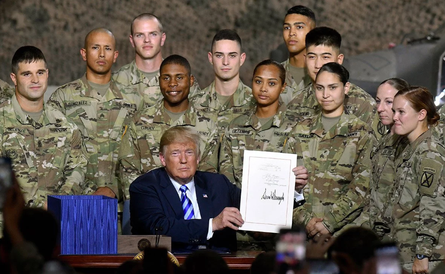 "Veríme, že naši vojaci si zaslúžia nástroje, vybavenie a prostriedky, ktoré vydobyli, keď cedili krv, pot a slzy," dodal Trump.
