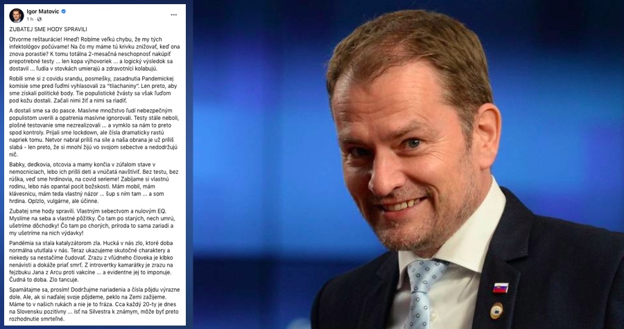 Upozornil, že čísla dramaticky rastú aj napriek prijatému lockdownu. „Netvor nabral príliš na sile a naša obrana je už príliš slabá – len preto, že si mnohí žijú vo svojom sebectve a nedodržujú nič," podotkol šéf vládneho kabinetu.