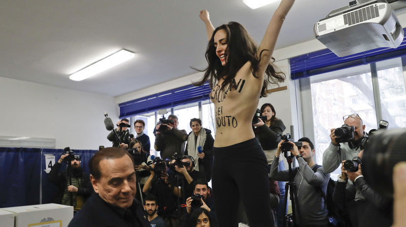 Žena mala na hrudi nápis „Berlusconi, už si za zenitom“ a vyskočila na stôl rovno pred bývalého premiéra, ktorý chcel hlasovať vo volebnej miestnosti v Miláne. Podľa agentúry AP aktivistky ženského hnutia Femen narušili Berlusconiho hlasovanie aj v roku 2013.