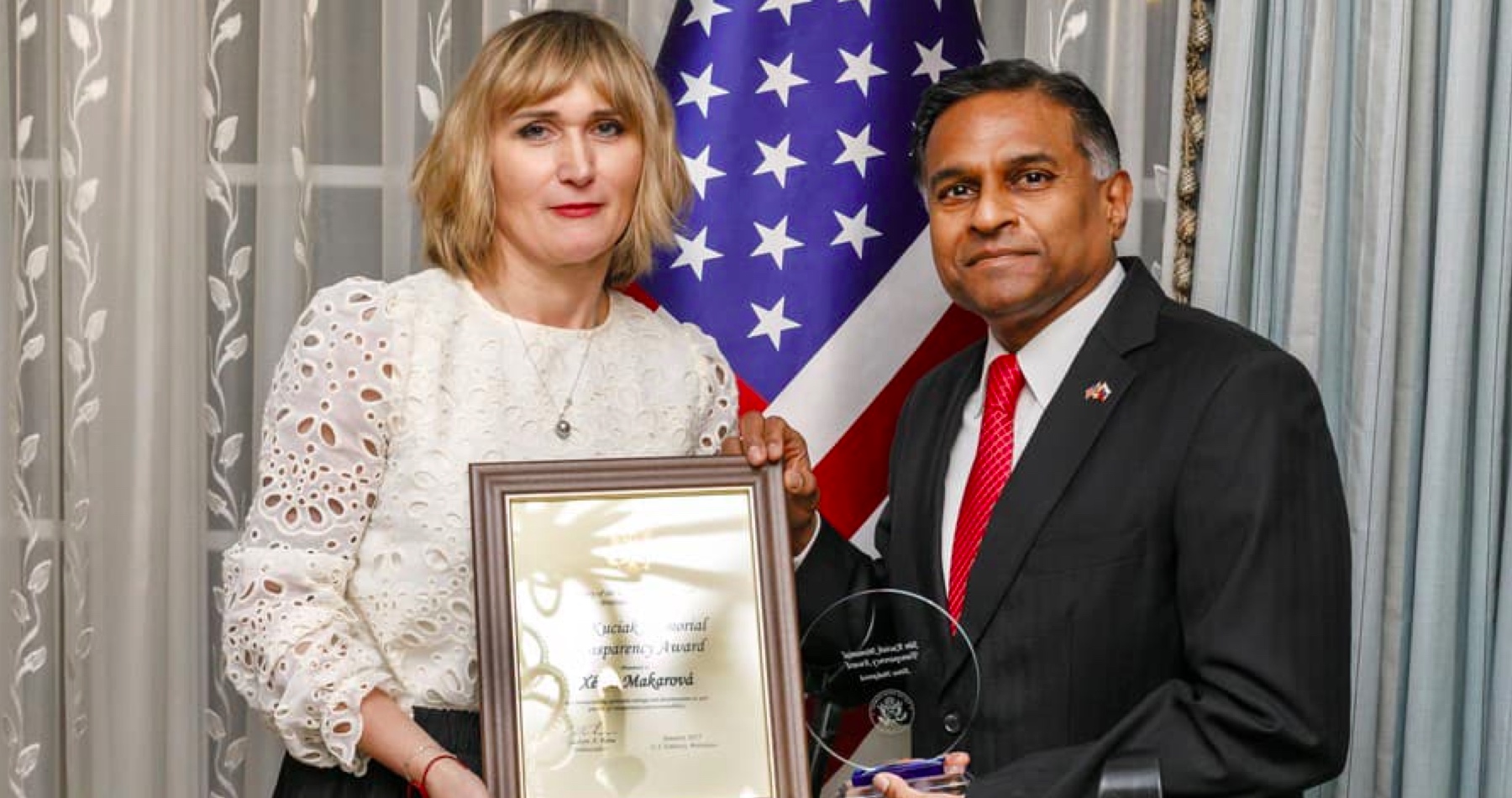 Cenu Jána Kuciaka za transparentnosť získala bývalá novinárka, analytička a zástupkyňa riaditeľky nadácie Zastavme korupciu Xénia Makarová. "Napriek hrozbám preukázala vytrvalú odvahu pri odhaľovaní korupcie. Pokračuje v odhaľovaní transakcií, o ktorých by sa verejnosť inak nedozvedela a obhajuje väčšiu transparentnosť a zodpovednosť," priblížilo veľvyslanectvo.