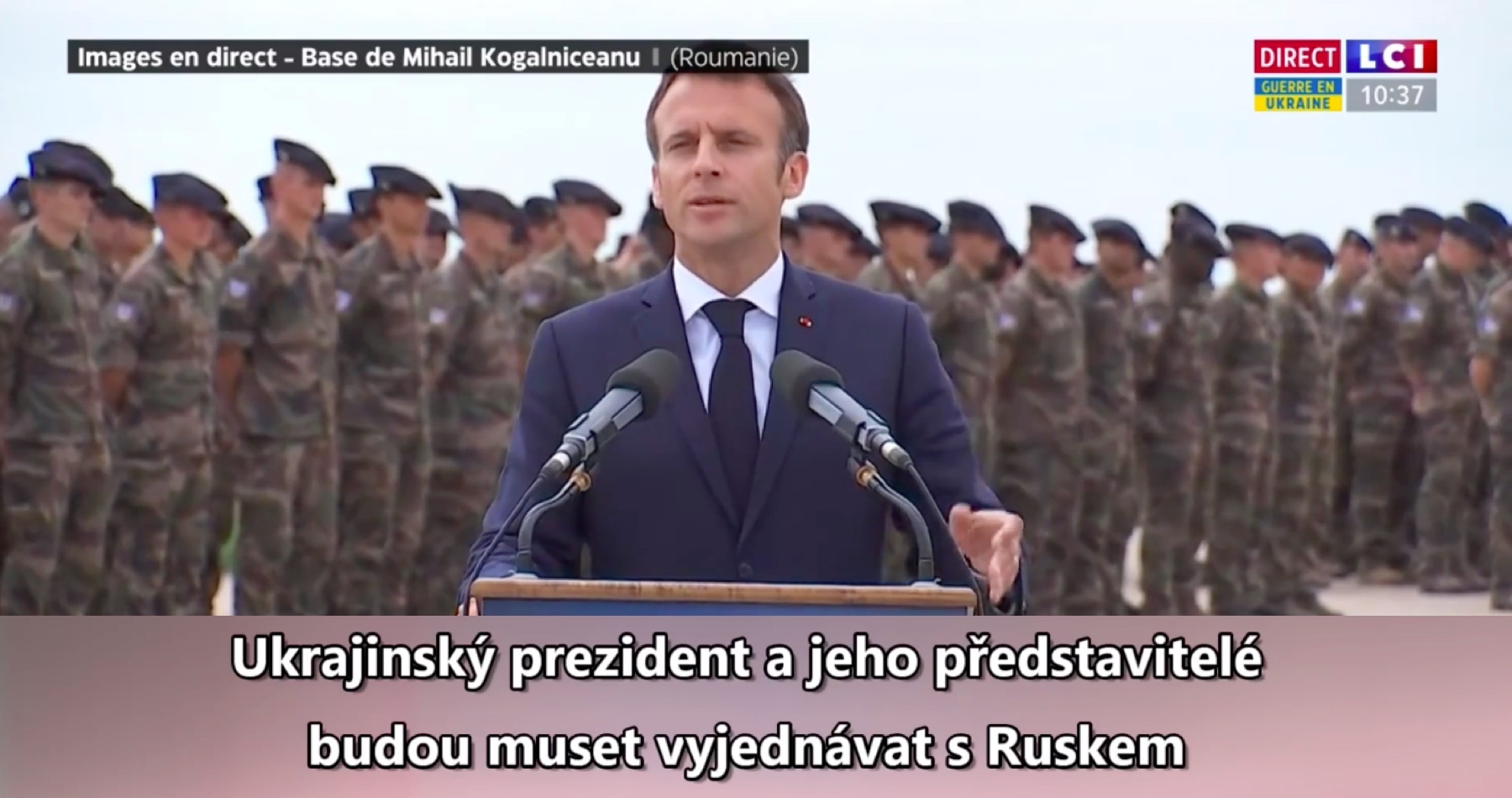 Emmanuel Macron navštívil francouzské vojáky na základ NATO v Rumunsku, kde ho přivítal rumunský prezident s typicky ne-rumunským jménem Klaus Iohannis (v Rumunsku je historicky početná německá diaspora) a politici mluvili především o situaci na Ukrajině a také o Moldávii a její snaze o vstup do EU. Nezáživný projev nabral grády a obrátky po dotazu korespondenta rádia France Internationale Romania, který Macronovi položil dotaz ohledně Macronova výroku o tom, že Rusko by nemělo být ponižováno.