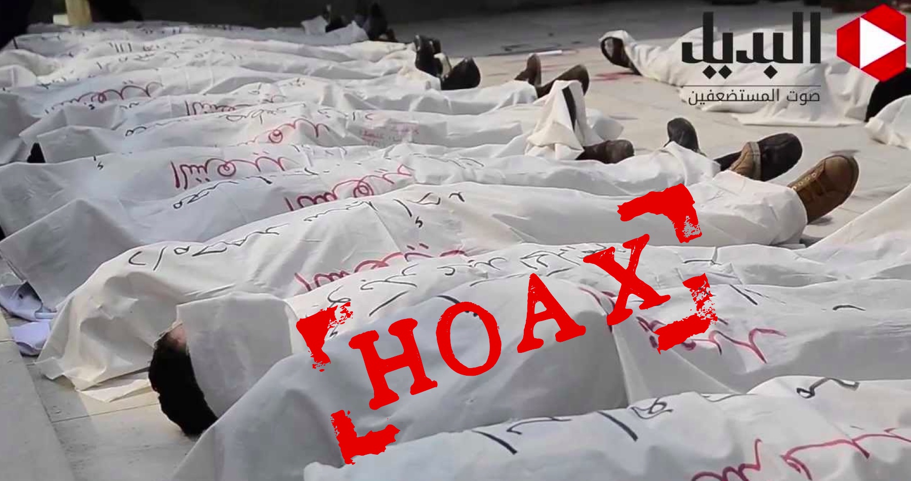Na videu je vidieť rad ležiacich tiel na zemi, prikrytých bielymi rubášmi s nápismi v arabčine. Niekoľko z týchto takzvaných mŕtvol sa na záberoch hýbe. Video sa šírilo aj v iných príspevkoch aj s označením, že je to cirkus pre médiá.