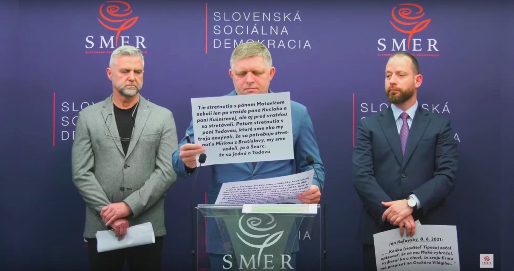 Bývalý premiér Robert Fico, policajný exprezident Tibor Gašpar a advokát Marek Para na tlačovej konferencii strany Smer-SD v stredu 22. marca 2023 informovali o ďalších odhaleniach zločinov súčasnej vlády, ktorá namiesto tradičnej politickej súťaže, kriminalizuje politických oponentov a kritikov režimu pomocou médií a úzkej skupiny ľudí pôsobiacich v rámci NAKA, ÚŠP a ŠTS.