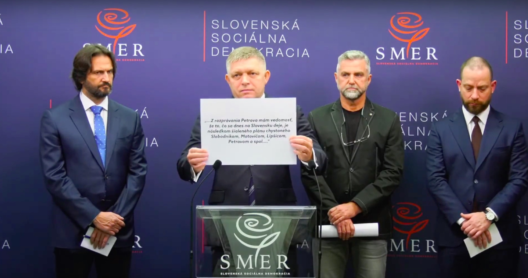 Bývalý premiér Robert Fico na tlačovej konferencii strany Smer-SD za účasti exministra vnútra Roberta Kaliňáka, advokáta Mareka Paru a policajného exprezidenta Tibora Gašpara informovali o ďalších šokujúcich nahrávkach, ktoré potvrdzujú brutálne manipulácie trestných konaní, za ktorými stoja vrcholní predstavitelia súčasného zločineckého režimu na Slovensku. Predseda Smeru-SD poukázal na to, že už aj niektorí sudcovia ŠTS začínajú chápať ako boli oklamaní a odmietajú špinavosti páchaných skupinou vyšetrovateľov v NAKA, ktoré kryje Lipšicova prokuratúra.