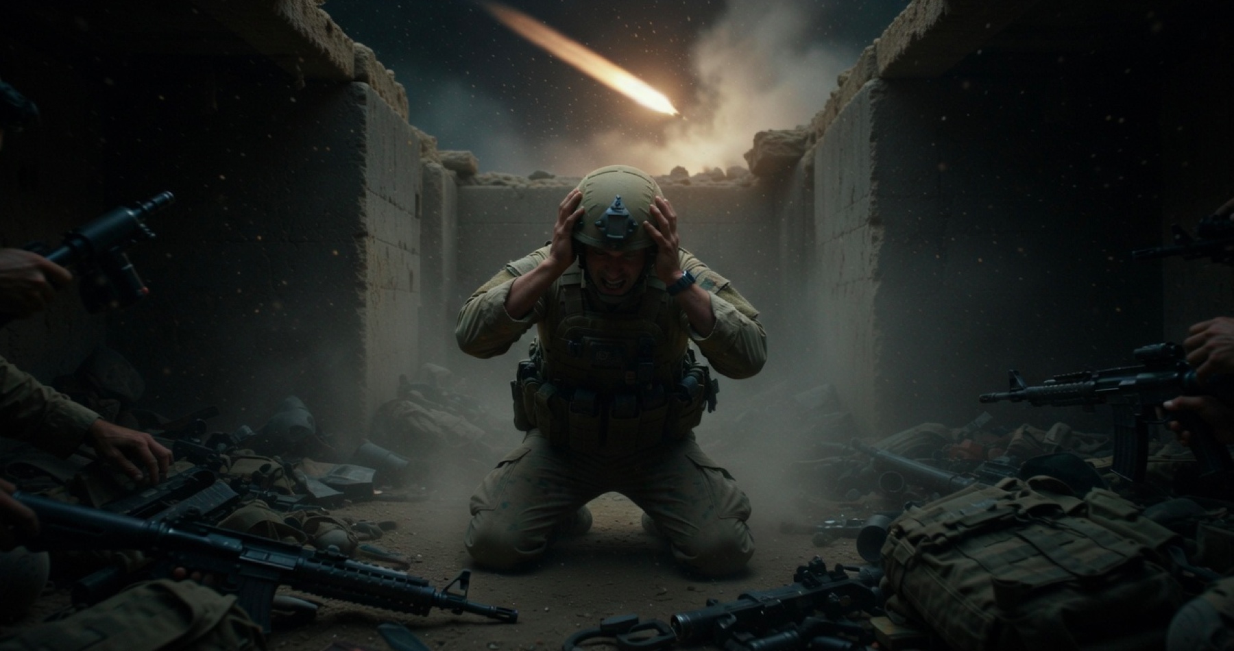 Vojaci sa podľa záberov nachádzajú v kryte alebo bunkri a reagujú na blízky zásah. Po výbuchu sa jeden z vojakov pýta, či sú všetci v poriadku, ostatní odpovedajú, že áno: