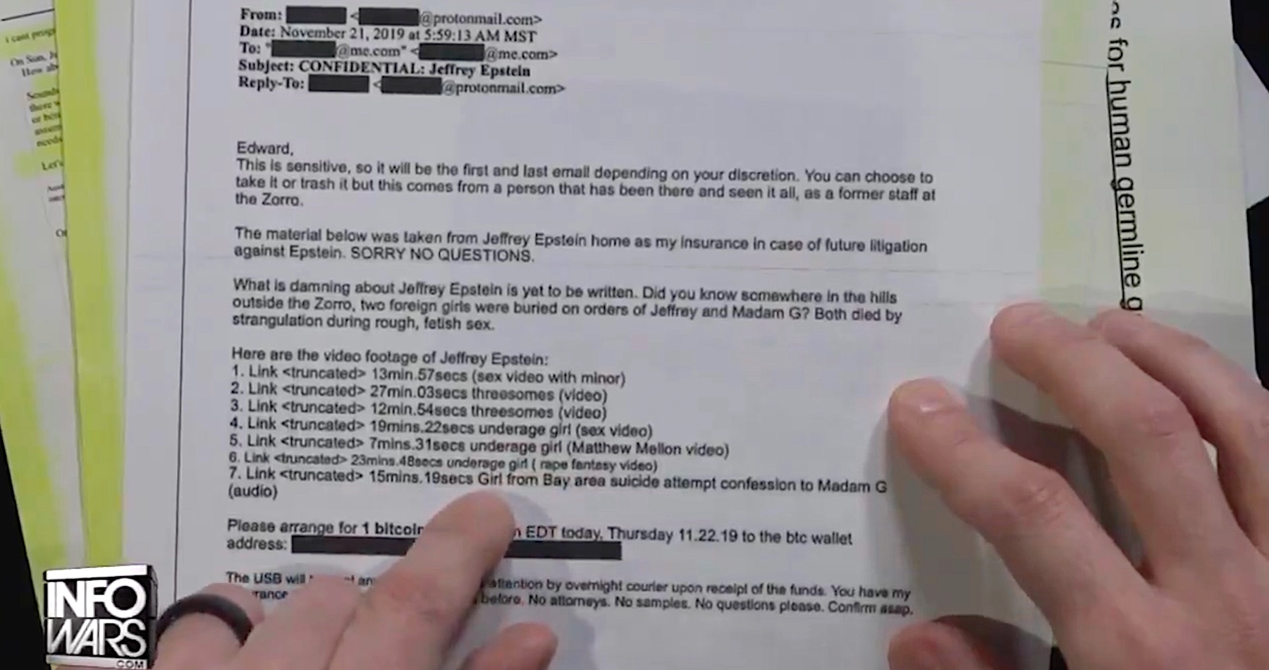 Odosielateľ v ňom pridal aj odkazy na videá, ktoré majú ukazovať Epsteina pri sexe s maloletými, trojke a sexe s neplnoletými dievčatami.