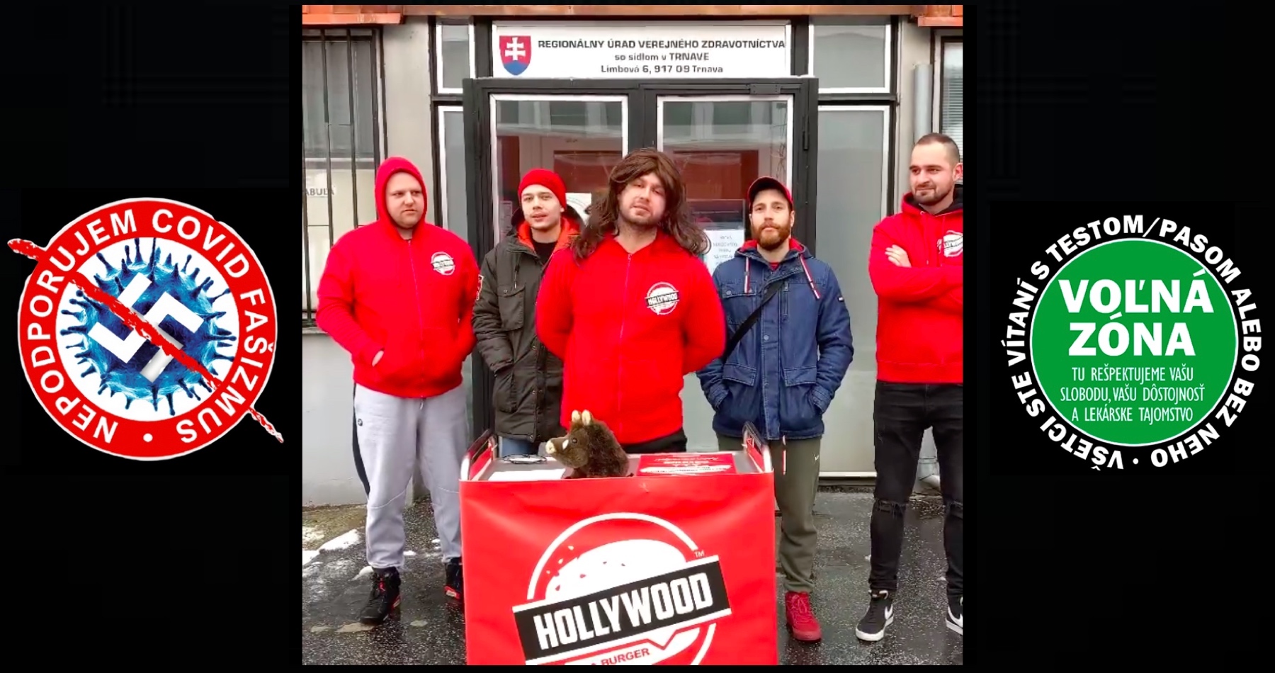 Neobvyklá tlačovka, samozrejme, bez účasti servilných médií. Miesto Trnava (aká náhoda), usporiadateľ - Hollywood Burger. Téma - symbolický veniec za slovenské gastro, vytvorenie účtu na právnu pomoc podnikateľom v gastre a informácie o nezákonných postupoch zo strany regionálnych úradov verejného zdravotníctva. To tvrdili jej usporiadatelia.