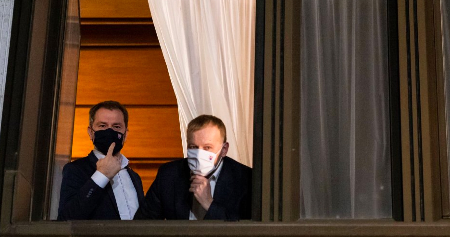 Premiér Igor Matovič (OĽaNO) a predseda parlamentu Boris Kollár (Sme rodina) informujú médiá na krčmovej úrovni z okna a servilní korporátni redaktori z mainstreamových médií im v tom sekundujú.