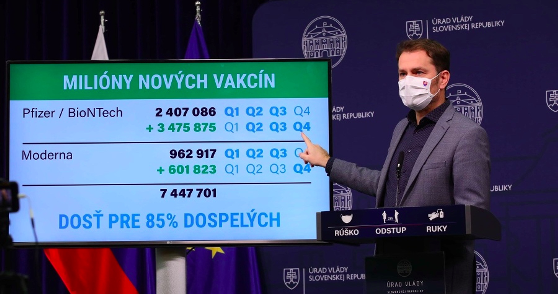 Do pondelka malo Slovensko zakontrahovaných viac ako 2,4 milióna vakcín od Pfizer/BioNTech a večer sa podarilo zakontrahovať vyše 3,4 milióna vakcín. Od Moderny mala SR 962 917 vakcín a v pondelok večer bolo zakontrahovaných ďalších 601 823. Spolu má tak k dispozícii Slovensko viac ako 7,4 milióna vakcín, informoval predseda vlády. Dodal, že očkovať sa tak môže 3,7 milióna ľudí.