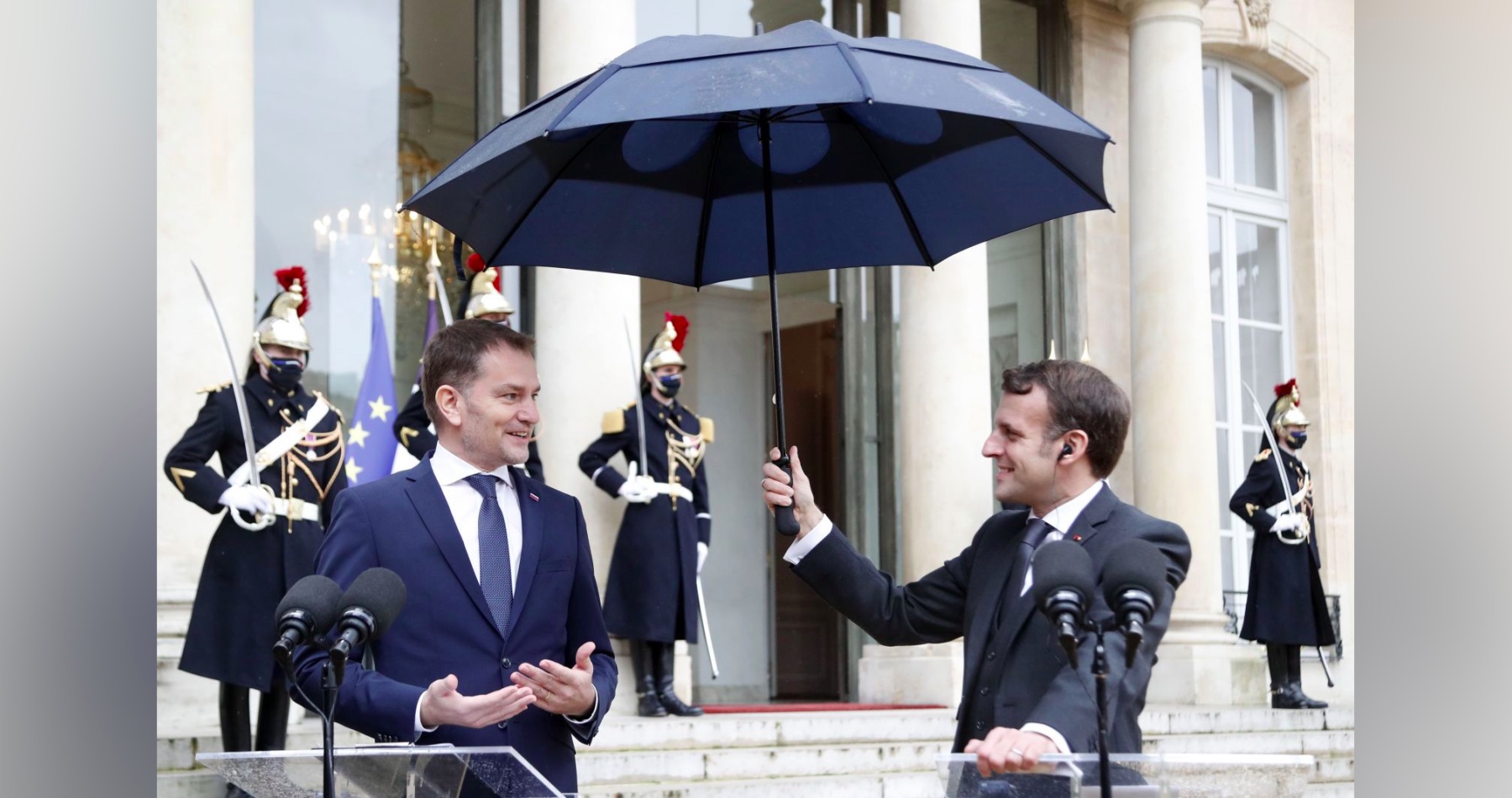 Predseda vlády Igor Matovič v stredu absolvoval stretnutie s francúzskym prezidentom Emmanuelom Macronom. Ten ho prijal vo svojom sídle v Elyzejskom paláci a napriek chvíľkovým prehánkam nad Parížom ani jeden z politikov nešetril úsmevmi. Vo chvíli, keď začalo pršať počas prejavu slovenského premiéra, mu dokonca Macron ochotne podržal nad hlavou dáždnik.