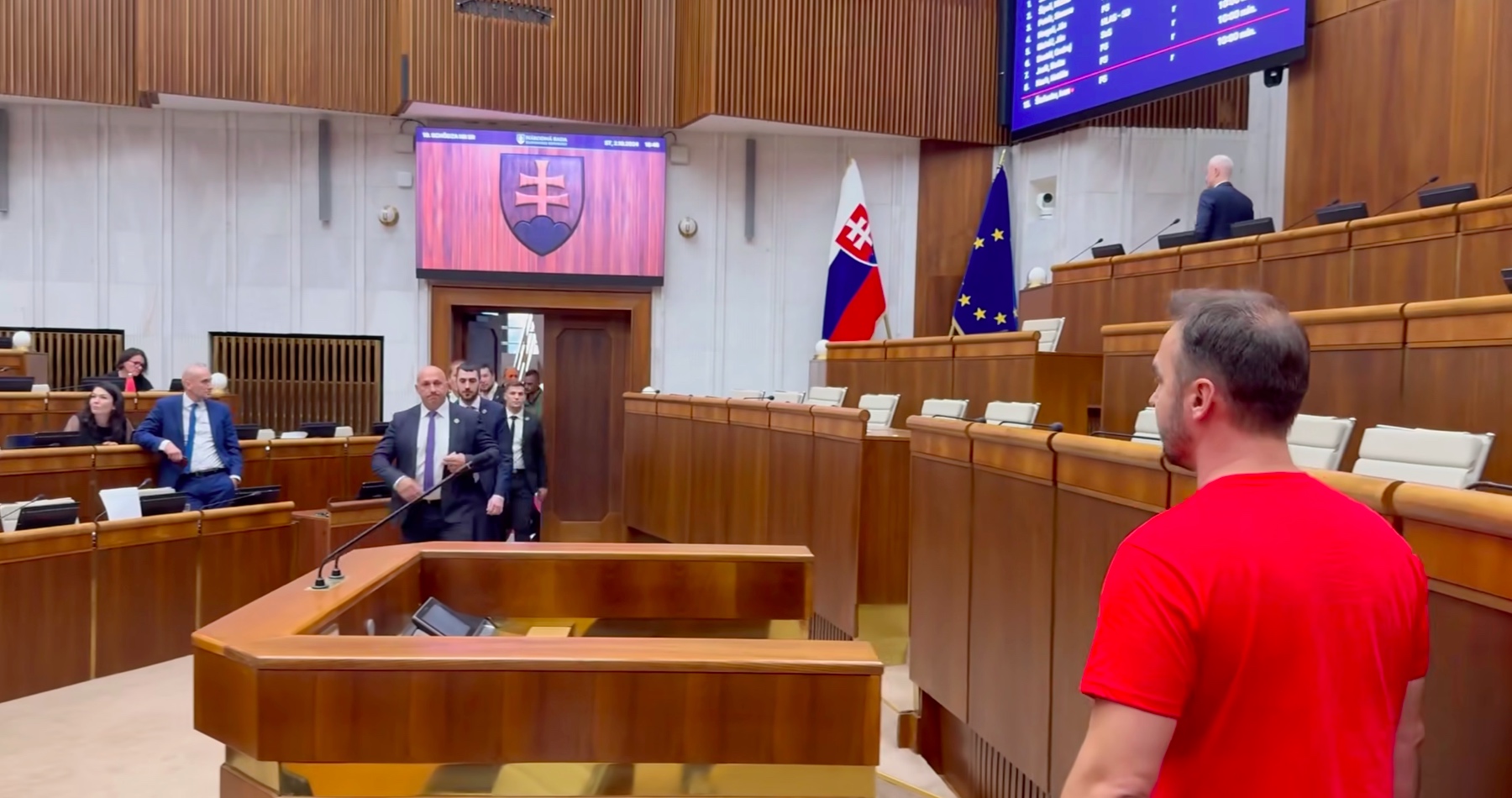 VIDEO: Matovičov poslanec provokoval v parlamentnom pléne straníckym tričkom. Gašparovu výzvu obliecť si naň aspoň sako odmietol, tak ho musel predsedajúci schôdze kvôli porušovaniu rokovacieho poriadku nechať vykázať ochrankármi z rokovacej sály