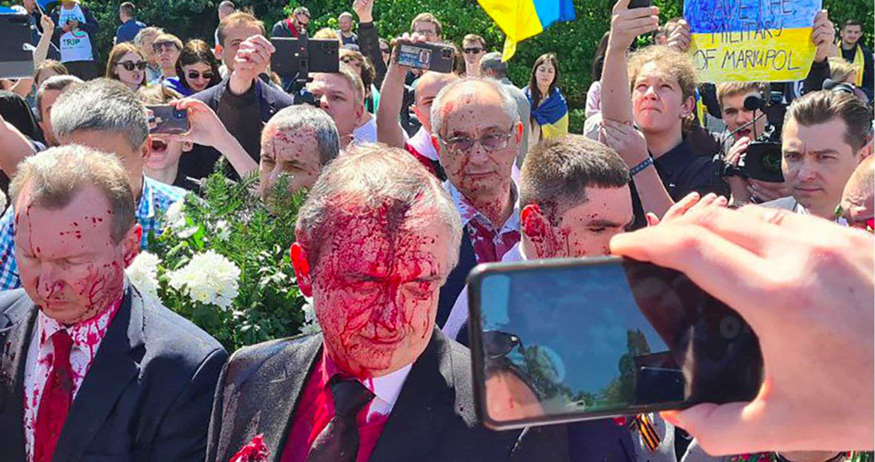 "Ľudia z davu sa pokúšali fyzicky napadnúť veľvyslanca. Niekoľko ľudí sa po ňom naťahovalo, ale odstrkávali ich strážcovia chrániaci veľvyslanca. V jednu chvíľu veľvyslancovi poliali tvár červenou farbou," vylíčila stanica.