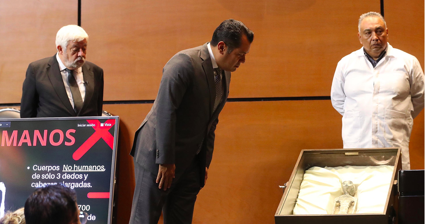 V mexickém Kongresu vystoupil pod přísahou novinář Jaime Maussan. Představil tam zvláštní pozůstatky dvou malých těl, o kterých tvrdí, že jsou mimozemského původu. Uvedl, že tyto ostatky nalezl na pláni Cusco v Peru a obsahují například prvky vzácného kovu osmium. Maussan na slyšení tvrdil, že představené ostatky byly zkoumány na Autonomní národní univerzitě v Mexiku například za pomocí radiokarbonové metody. Informuje například The Independent.
