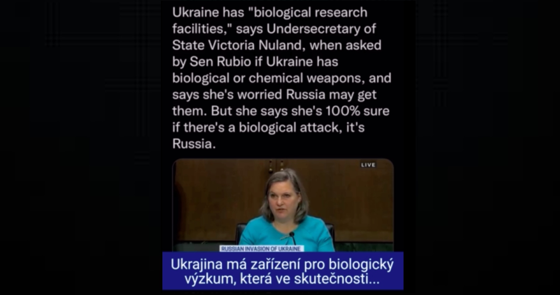 "Ukrajina má biologické výskumné zariadenia a v skutočnosti nás teraz dosť znepokojuje, že ruské jednotky – ruské sily – sa môžu snažiť získať kontrolu nad nimi," uviedla v utorok námestníčka ministra zahraničných vecí USA pre politické záležitosti Victoria Nulandová na vypočutí pred americkými zákonodarcami, keď sa jej priamo pýtali, či má Ukrajina biologické zbrane.