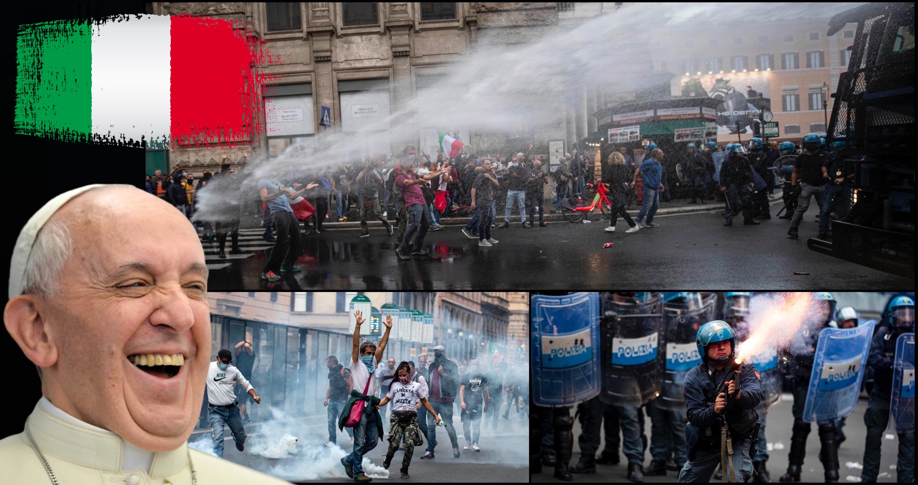 Videá ukazujú veľké policajné manévre v uliciach plných skandujúcich a búriacich sa ľudí. Talianska vláda vydala mimoriadne kruté obmedzenia pre nezaočkovaných obyvateľov. Tí pod vysokými pokutami nesmú chodiť do práce, no zároveň ani nedostávajú plat a nie je zamestnávateľom dovolené ich prepustiť. V praxi to potom znamená, že takýto človek si na úrade práce nemôže zažiadať ani o podporu v nezamestnanosti a nemôže si legálne ani zohnať inú prácu. Pápež František už bol kritizovaný za to, že sa týchto ľudí verejne nezastal.
