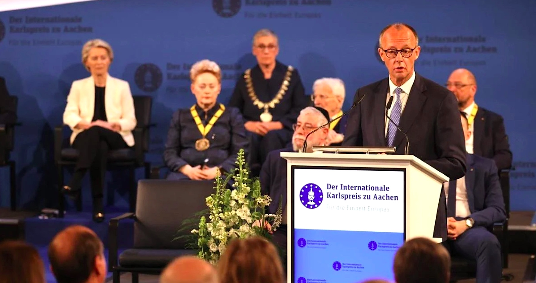 VIDEO: Nemecký kancelár Merz, ktorý je stelesnením totalitnej a znacifikovanej podoby Európy, prenasledujúcej suverénnu mierovú politiku národných štátov a umlčiavajúcej nepohodlné názory vlastných občanov, predviedol ukážkovú „chucpe“, keď vyhlásil, že „Európa je v prípade potreby pripravená bojovať za slobodu a demokraciu“. Po jeho arogancii a bezočivosti prišiel cynizmus najhrubšieho zrna: šéfke eurokomisie von der Leynovej, namočenej do multimiliardového korupčného škandálu „Pfizergate“, bola udelená Cena Karola Veľkého za jej úlohu počas covidizmu, protiruského ťaženia a za likvidovanie ekonomiky EÚ zelenou dohodou. Absurdnosť ceremónie zaklincovala vrchná európska vojnová štváčka a rusofóbka vyhlásením, že „svet opäť formujú imperiálne mocnosti a imperiálne vojny“