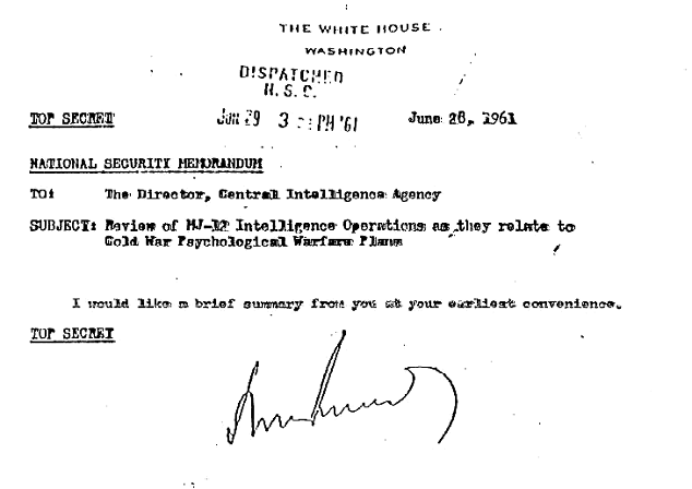 28. júna 1961 prezident Kennedy podpísal prísne tajné memorandum o národnej bezpečnosti, v ktorom požiadal riaditeľa CIA Allena Dullesa, aby pre neho pripravil "prehľad spravodajských operácií skupiny MJ-12 v súvislosti s plánmi psychologickej vojny".