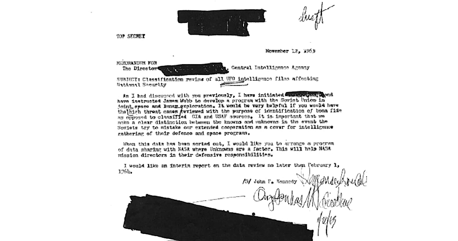 Po zlyhaní sovietskej misie na Mars dňa 11. novembra 1963 pod názvom Kosmos 21 dosiahol deň na to Kennedy s vtedajčím lídrom Sovietskeho zväzu Nikitom Chruščovom dohodu ohľadňe spoločnej vesmírnej misie ako aj zdieľania informácii ohľadne UFO. Kennedy dňa 12. novembra 1963 vydal memorandum o zdieľaní spisov o UFO s organizáciou NASA a Sovietmi, ktoré bolo zaslané šéfovi CIA Johnovi A. McConeovi, ktoré bolo následne odovzdané vtedajšiemu šéfovi kontrarozviedky CIA Jamesovi Angletonovi, ktorý kontroloval prístup k spisom o UFO a bol zároveň v styku s organizáciou Majestic 12 (MJ-12).