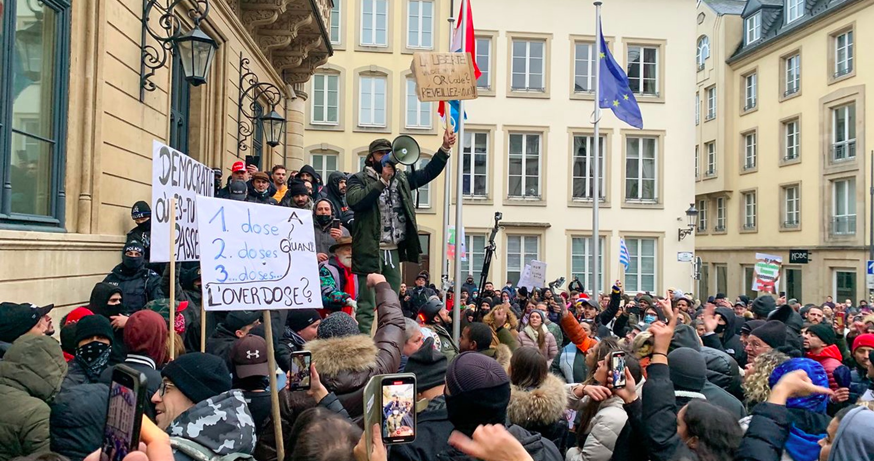 Podle informací lucemburské policie se v sobotu odpoledne v Lucemburku sešlo zhruba 2 000 demonstrantů, kteří protestovali proti vládním opatřením. Původně se konaly dvě demonstrace, jedna na náměstí Glacis, druhá na Kinnekswiss. Policie byla na místě s větším kontingentem lidí.