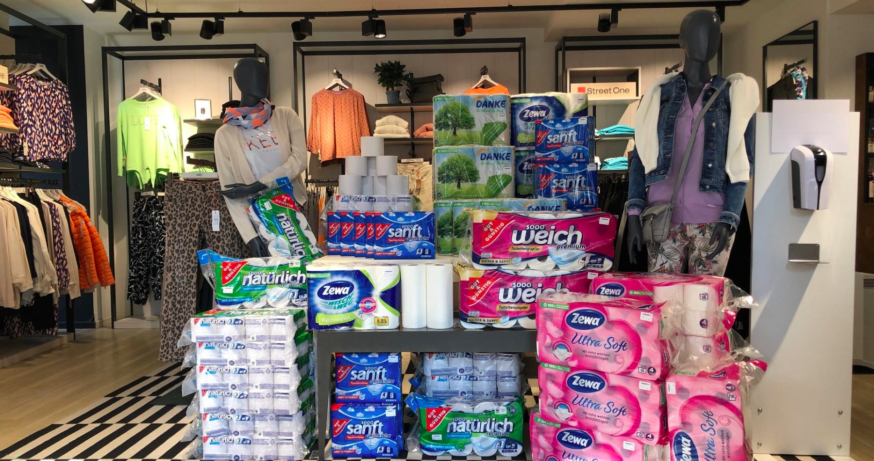 Mezi oblečením z nové jarní kolekce leží role toaletního papíru, ale také mouka či nudle. Oděvní dům Kuhn v Německu se nechal „přehlásit“ na drogerii a obchází tak nařízení zavřených obchodů během pandemie koronaviru.